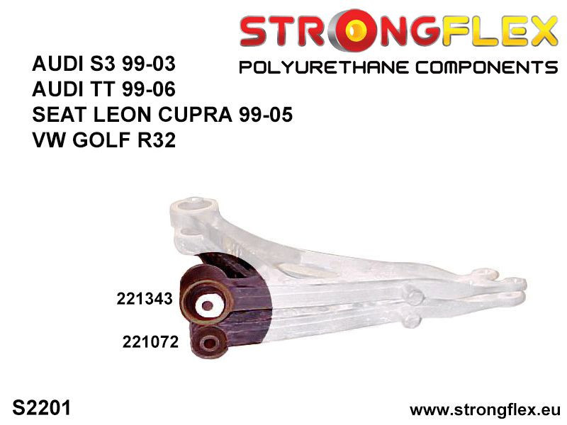 There are two types of front wishbone bushes, later models had larger Ø45mm bushes (221343), while earlier models were equipped with smaller Ø30mm bushes (221072). Before you place your order, please check carefully which bushing you have in your car (See photo S2201)!