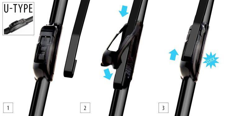 UNIVERSAL WIPES WITH NO-FRAME TYPEUniversal frameless U-type wipers. 9 mm U-type and 8 mm U-type mounting in one. U-type wipers are characterized by the so-called "U" shaped "hook". Feathers without a skeleton structure with an integrated spoiler, a unique silicone-rubber mixture, the attachment of the catch under the cover is made entirely of metal. The metal parts were made of durable High-Carbon steel completely galvanized to protect against corrosion for a long and effective time.