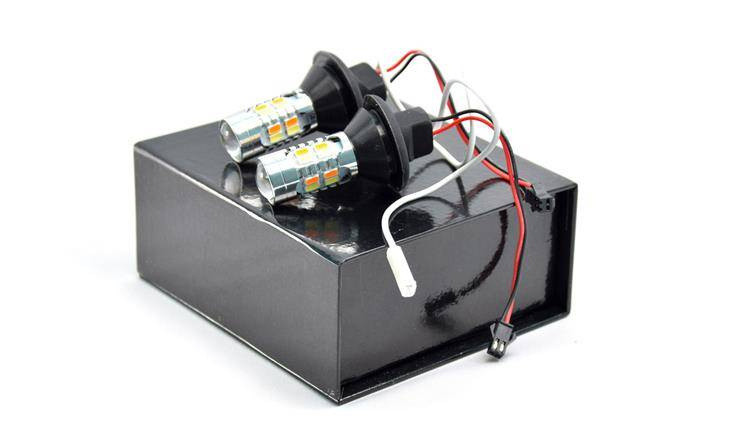 These leds are mounted in the socket of the direction indicator bulb. Thanks to the use of two colors of diodes on one bulb, the effect simulating daylight DRL (white diode) or indicator light (orange diode) was obtained.