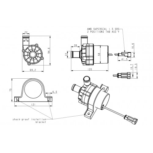 A pumpa zárt, recirkulációs rendszerhez készült és nem önfelszívó, így a beépítésnél a kör feltöltése és légtelenítése kulcspont. Autóipari környezetben UN ECE Regulation 10 megfelelőséggel rendelkezik elektromágneses kompatibilitás (EMC) célra.