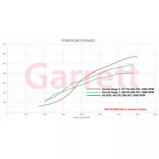 A csomag tartalmaz kalibrált elektronikus wastegate aktuátort, a kompresszorházon sebességszenzor portot, valamint GTX Gen II mart, kovácsolt kompresszorkereket és MAR-M turbinalapátot. A megadott cél +17% áramlás egy standard IS38 turbóhoz képest, a turbóház hőállósága 1 050 °C.